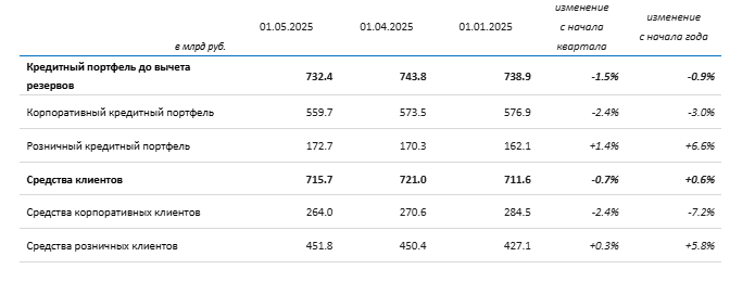 - На 1 мая 2025 года Кредитный портфель до вычета резервов составил 732.4 млрд рублей (-0.9% по сравнению с 1 января 2025 года). Корпоративный кредитный портфель снизился с начала года на 3.0% и составил 559.7 млрд рублей. Розничный кредитный портфель вырос с начала года на 6.6% и составил 172.7 млрд рублей. По состоянию на 1 мая 2025 года уровень просроченной задолженности составил 2.7%. (2.7% по состоянию на 1 января 2025 года). Уровень покрытия резервами просроченной задолженности на 1 мая 2025 года составил 136.9%. (141.9% по состоянию на 1 января 2025 года). ─ На 1 мая 2025 года Средства клиентов составили 715.7 млрд рублей (+0.6% по сравнению с 1 января 2025 года). Средства корпоративных клиентов снизились с начала года на 7.2% и составили 264.0 млрд рублей. Средства розничных клиентов выросли с начала года на 5.8% и составили 451.8 млрд рублей.