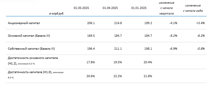 На 1 мая 2025 года Акционерный капитал составил 206.1 млрд рублей (+3.4% по сравнению с 1 января 2025 года). ─ Собственный капитал Банка, рассчитанный в соответствии с методикой ЦБ РФ (Базель III), на 1 мая 2025 года составил 196.4 млрд рублей (-0.8% по сравнению с 1 января 2025 года). Основной капитал Банка по состоянию на 1 мая 2025 года составил 169.5 млрд рублей (-8.2% по сравнению с 1 января 2025 года). В результате норматив достаточности основного капитала Банка на 1 мая 2025 года составил 17.8% (20.4% на 1 января 2025 года); норматив достаточности собственного капитала составил 20.6% (21.8% на 1 января 2025 года). На динамику собственного капитала и нормативы достаточности капитала на 1 мая 2025 года оказало влияние решение Годового заседания Общего Собрания Акционеров Банка от 24 апреля 2025 года о выплате дивидендов по итогам 2024 года в размере 13.2 млрд руб. (всего 25.4 млрд руб. за 2024 год, включая выплаченные дивиденды за 1П 2024 года в объеме 12.2 млрд руб.). До проведения аудита чистая прибыль за 4M 2025 года не учитывается в расчете основного капитала и норматива достаточности основного капитала. Оценочное влияние аудита прибыли за 4M 2025 на достаточность основного капитала составляет +2.1 п.п.