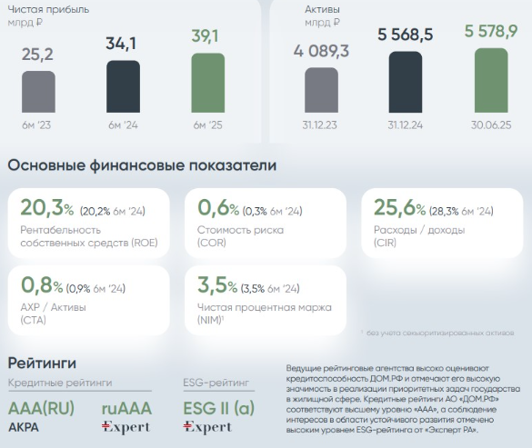 Генеральный директор АО «ДОМ.РФ» Виталий Мутко: По итогам первого полугодия основные финансовые показатели Группы выросли благодаря диверсифицированной бизнес-модели, которая обеспечивает устойчивость компании в том числе в непростой период для отрасли жилищного строительства. Чистая прибыль ДОМ.РФ увеличилась на 15% до 39,1 млрд рублей, на этом фоне рентабельность капитала достигла уровня 20,3%. В июне 2025 года компания также объявила о выплате дивидендов по итогам 2024 года в размере 23,7 млрд рублей. Наши направления деятельности, среди которых проектное финансирование, инфраструктурные и ипотечные облигации, показали свою эффективность и востребованность у бизнеса и инвесторов. Мы продолжим масштабировать проекты, направленные на создание качественного и доступного жилья, развитие инфраструктуры и улучшение качества городской среды. Основные достижения 1 полугодия 2025 года — Кредитный портфель компании Группы увеличился на 10% до 2,8 трлн руб., при этом портфель кредитов проектного финансирования вырос на 14% и достиг 1,7 трлн руб. — В портфеле арендного жилья ДОМ.РФ находятся 83 проекта в 19 регионах – это 22,5 тыс. квартир и апартаментов. Средняя заполняемость арендных домов в 1 полугодии 2025 года составила 98% — В 1 полугодии ДОМ.РФ запустил вторую государственную программу в рамках механизма инфраструктурных облигаций – направление по финансированию лизинга сельскохозяйственной, коммунальной и дорожно-строительной техники объемом 380 млрд руб. — ДОМ.РФ секьюритизировал более 28 тыс. ипотечных кредитов и разместил 4 выпуска ипотечных облигаций на общую сумму 107 млрд руб. (+2% к 1 полугодию 2024 года) — 1,7 трлн руб. составил объем ипотечных ценных бумаг с поручительством ДОМ.РФ в обращении — За 6 месяцев 2025 года ДОМ.РФ реализовал на торгах 104 земельных участка площадью 235 га и 264 объекта недвижимости в 37 субъектах — ДОМ.РФ заключил первый агентский договор в рамках нового направления по реализации объектов недвижимости и земельных участков, находящихся в частной собственности