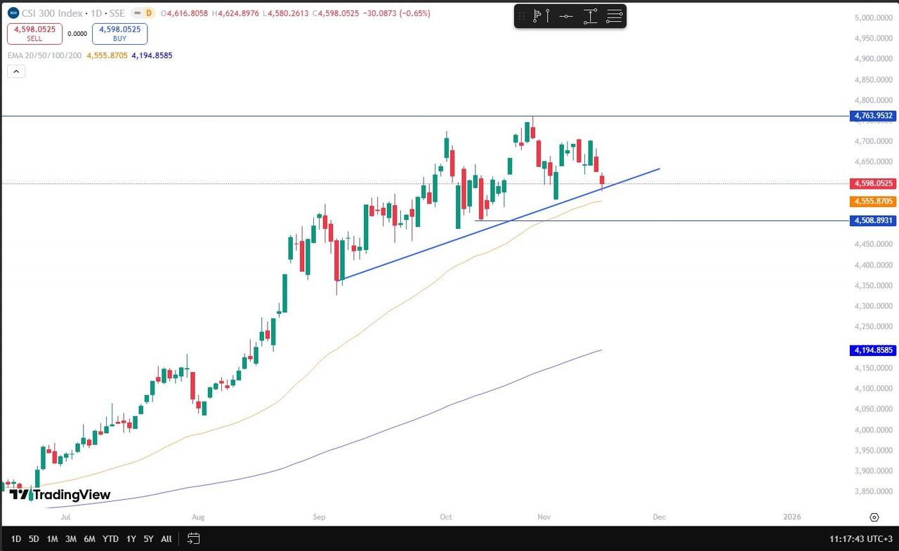 CSI 300 Китайский индекс CSI300 начал коррекцию от зоны сопротивления в 4763,95 п. Зоной поддержки может стать уровень 4508,89 п.