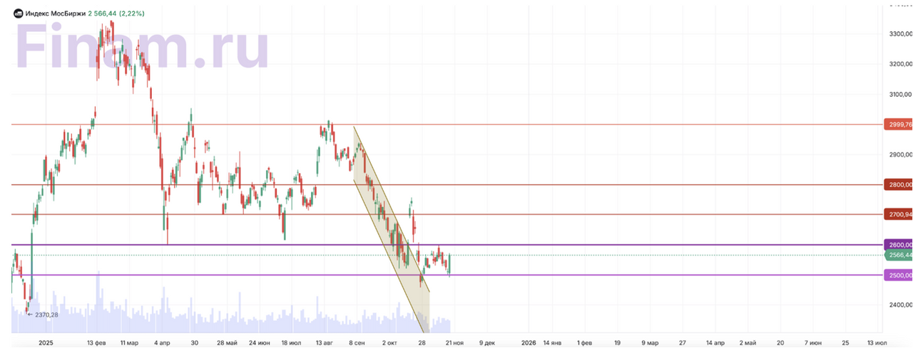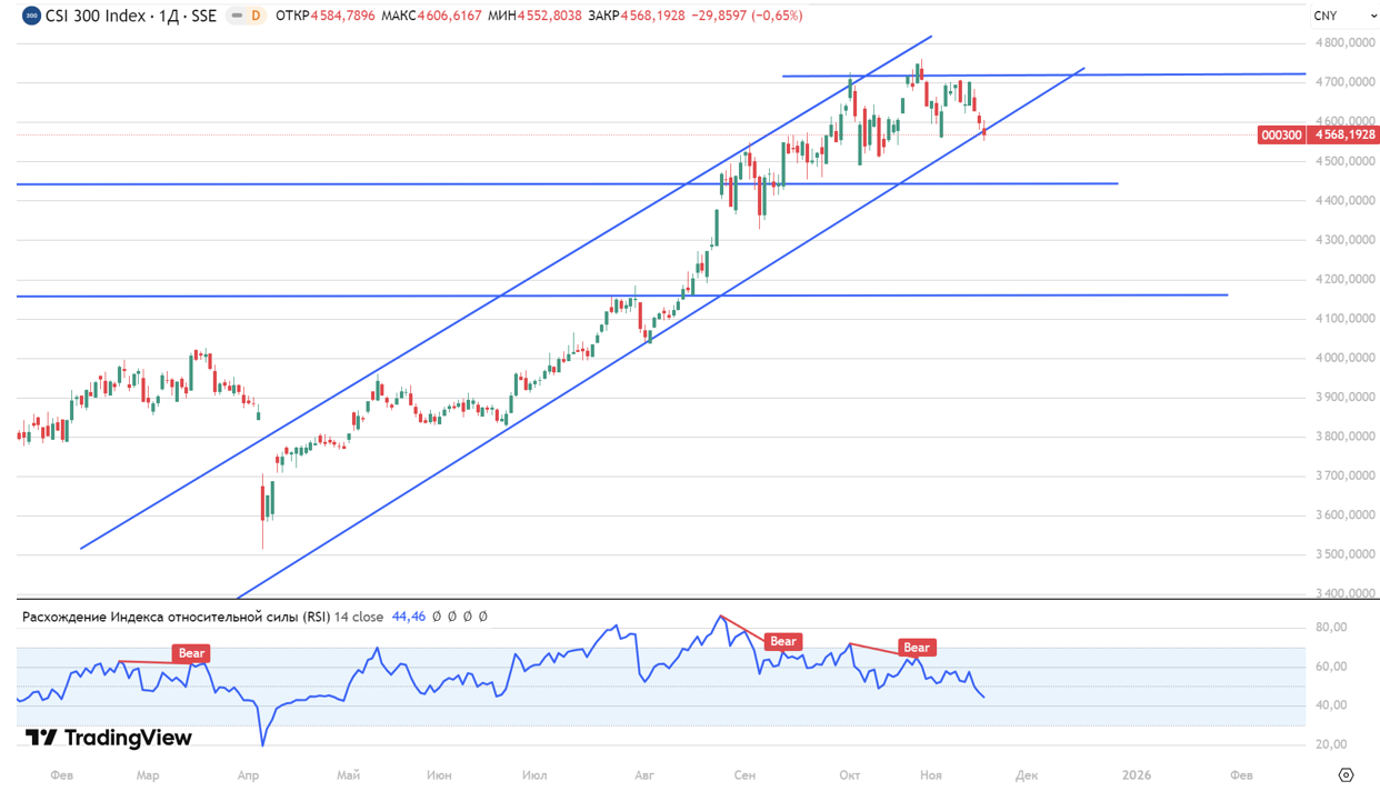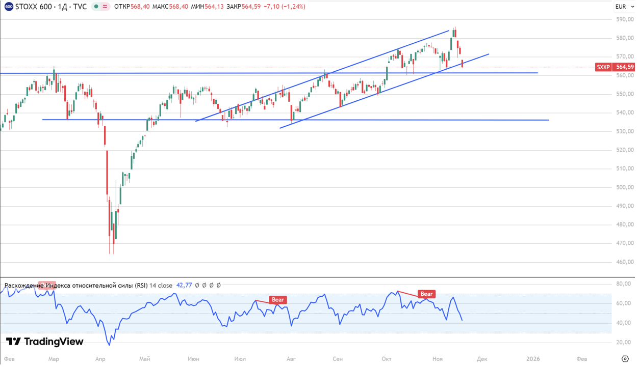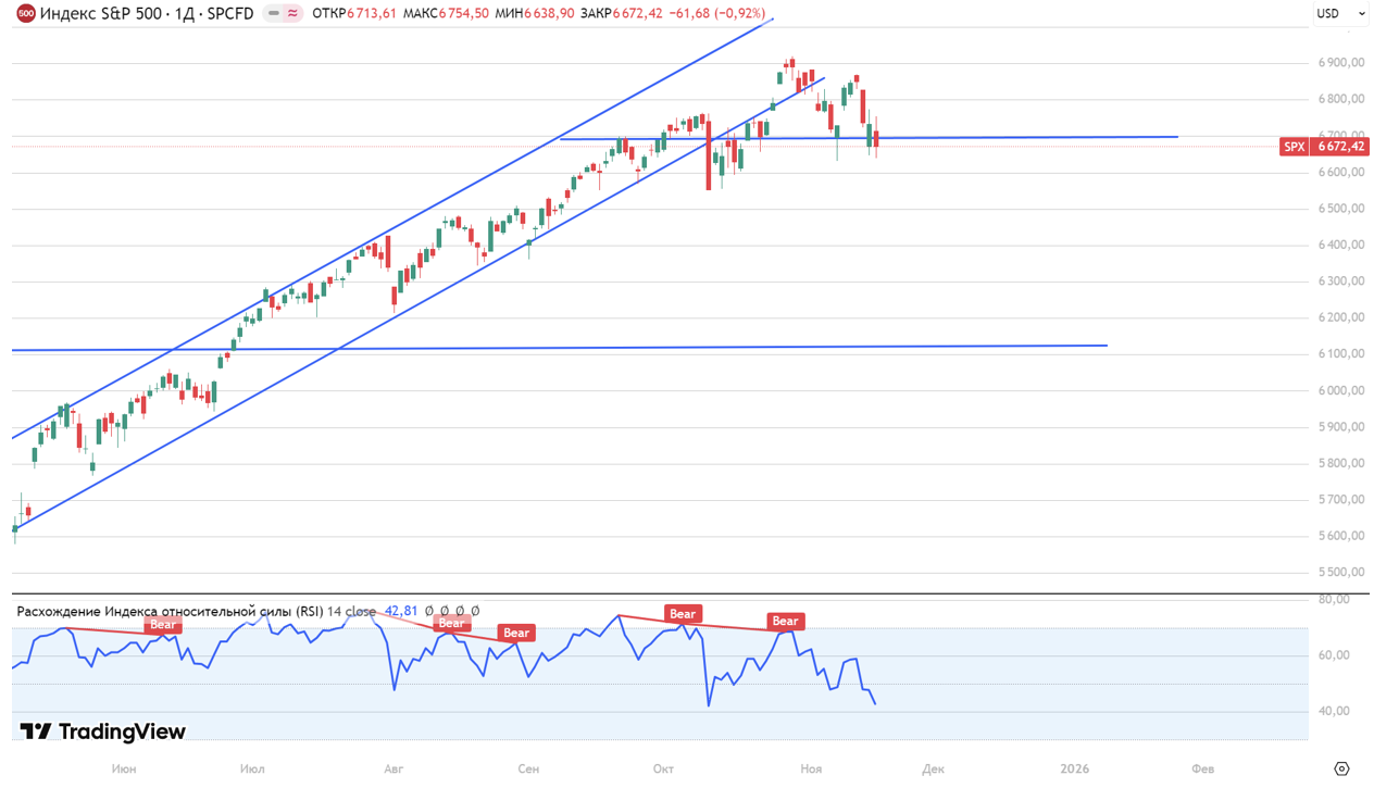 Американские индексы начали неделю в минусе на фоне ожидания важной макростатистики, публикация которой была отложена из-за шатдауна. Во вторник Минторг покажет изменение заказов промпредприятий, в среду — внешнеторговый баланс, в четверг Бюро статистики опубликует отчёт по рынку труда за сентябрь — все эти данные изначально планировались на начало октября. На этой неделе отчётность представят Nvidia, Home Depot, Target, Walmart, Palo Alto Networks и Intuit; эксперты предупреждают об усилении волатильности в секторе технологий из-за отчёта Nvidia. По итогам вторника: Dow Jones — −557,24 пункта (−1,2%) до 46 590,24; S&P 500 — −61,7 пункта (−0,9%) до 6 672,41; Nasdaq Composite — −192,51 пункта (−0,8%) до 22 708,07. Капитализация Alphabet Inc. повысилась на 3,1%, после того как Berkshire Hathaway объявила о покупке акций владельца Google на сумму около $4,3 млрд. Во вторник фьючерс на S&P 500 торгуется в -0,55%, так как на рынке начинают копиться негативные настроения. Европейские площадки торгуются в отрицательной зоне, следуя общей негативной динамике мировых рынков. Индекс FTSE 100 теряет 0,95% и опускается к отметке 9 583,50 пункта, французский CAC 40 снижается на 1,55% до 7 993,39 пункта, германский DAX — на 1,22% до 23 291,62 пункта. Европейский Stoxx 600 также в минусе, поддерживая нисходящий тренд, — минус 1,24% до 564,54 пункта. Давление на европейские активы усиливают одновременно слабый внешний фон и осторожность инвесторов перед публикацией важной макростатистики в США: участники рынка предпочитают сокращать риск неопределенности. Рынки акций крупнейших стран Азиатско-Тихоокеанского региона снижаются на торгах во вторник вслед за спадом на Уолл-стрит накануне. Китайский индекс CSI 300 снижается на 0,65% до 4 568,19 пунктов из-за обострения отношений между Китаем и Японией после заявления премьер-министра Японии Санаэ Такаити о том, что Токио может дать военный ответ в случае атаки Китая на Тайвань. Эти слова вызвали негативную реакцию со стороны Пекина. Hang Seng также торгуется в сильном минусе, по итогам сессии -1,98% до 25 863п. Среди лидеров падения гиганты Lenovo (-4,46%) и BYD (-3,82%). Спад ограничивают ожидания сохранения ключевых процентных ставок Народным банком Китая на минимуме. Японский индекс Nikkei 225, как и весь регион АТР, завершил торги снижением — индекс опустился до 48 728,50 пунктов, потеряв 3,17%. Во вторник Такаити, считающая сторонницей мягкой денежно-кредитной и налоговой-бюджетной политики, проведет встречи с главой Банка Японии Кадзуо Уэдой и налоговой комиссией правительства. В лидерах падения производитель электроники Fujikura (-9,90%), SoftBank (7,42%) и конгломерат Hitachi (-6,87%). Корейский рынок также оказался под давлением, отражая ухудшение настроений в регионе АТР. Индекс KOSPI снизился на 3,32% и завершил сессию на отметке 3 953,62 пункта, что сигнализирует об усилении распродаж в азиатских активах. Примечательно, что коррекция происходит на фоне объявленных планов крупнейших южнокорейских конгломератов инвестировать рекордные суммы в экономику страны: Samsung — 450 трлн вон, Hyundai — 125 трлн вон, LG — 100 трлн вон. Совокупно это более полутриллиона долларов, однако даже столь впечатляющие инвестиционные инициативы не смогли в краткосрочной перспективе поддержать рыночную динамику. В лидерах падения Samsung Publis (-22,07%), Koas (-14,26%), Isu Chemical Co (-10,68%), гигант LG (-6,04%). Российский рынок сегодня, 18 ноября, отреагировал оптимизмом и «воспрял» в надежде на возобновление переговорного процесса — инвес