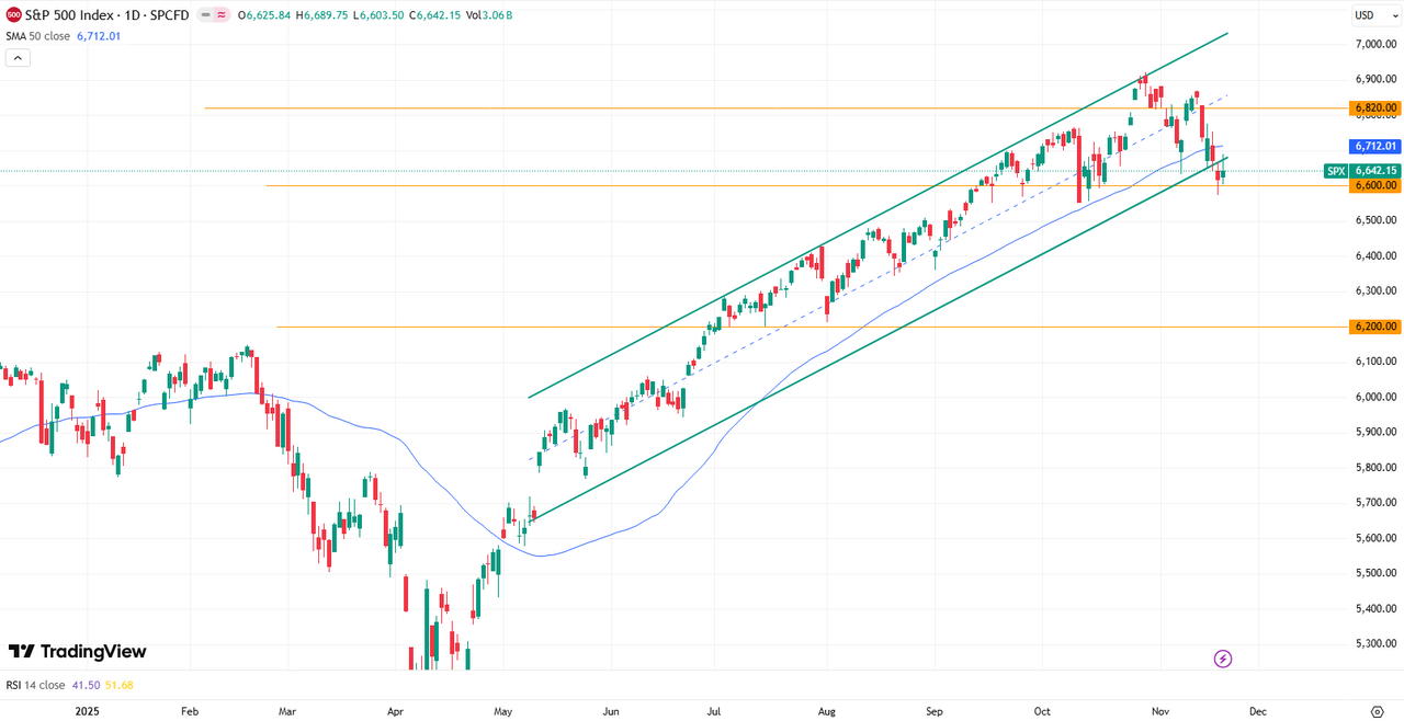 S&P 500 Индекс S&P 500 по итогам последней сессии подрос до 6642 пунктов и остался ниже границ среднесрочного восходящего канала и 50-дневной скользящей средней, что усиливает риски для «быков» и указывает на ослабление восходящего импульса. Ключевым фактором для дальнейшей динамики станет реакция рынка на сильную отчетность NVIDIA: если в ближайшие дни индекс не сможет закрепиться выше 50-дневной SMA, вероятно движение в боковом диапазоне 6820–6600 пунктов.