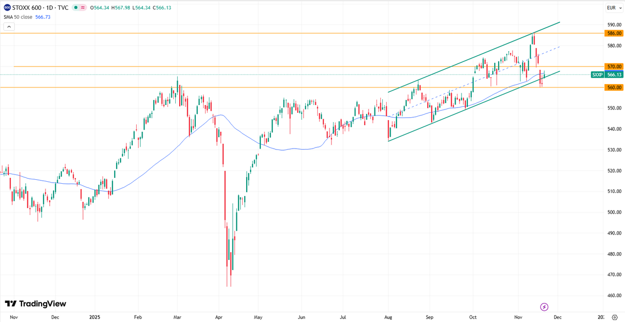 Euro STOXX 600 Индекс Stoxx 600 на дневном графике растет до 566,3 пункта. Ближайшая цель быков – пробой и закрепление выше уровня сопротивления 570.