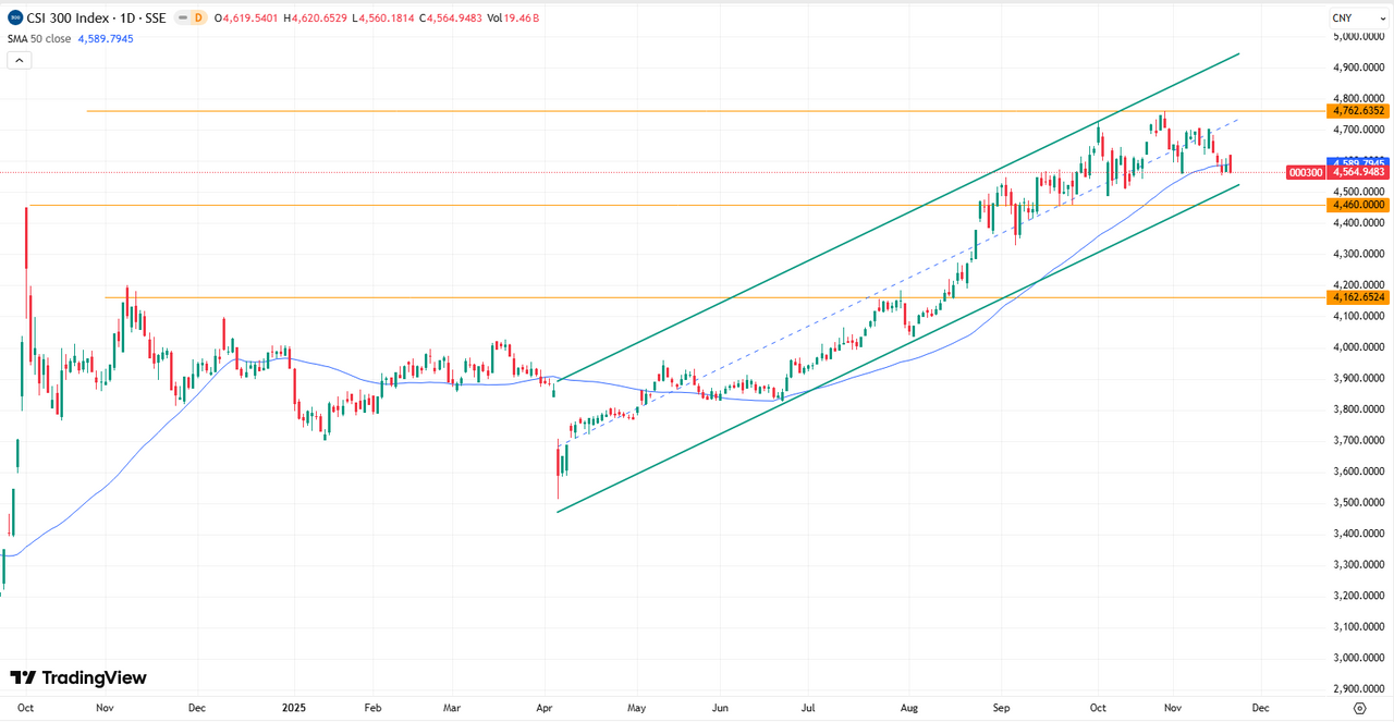 CSI 300 Индекс CSI 300 на дневном графике закрылся на отметке 4565 пунктов, вблизи нижней границы восходящего канала. Судя по динамике последних дней индекс теряет импульс роста, оставаясь ниже линии 50 дневной SMA. При сохранении коррекционного движения поддержкой выступит уровень 4460 пунктов.