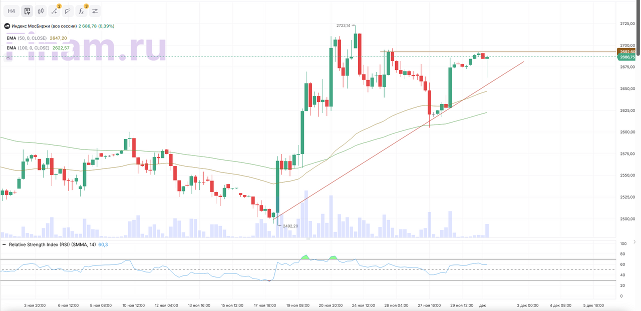 Индекс МосБиржи в начале декабря демонстрирует рост на 0,31% до 2684 п. на фоне продвижения мирных переговоров. На выходных прошла встреча представителей Украины и США, которую американская сторона назвала продуктивной, а сегодня в Москву приезжает спецпосланник президента США для переговоров с российским руководством. К тому же в ближайшие дни ожидается визит главы МИД Китая. Все эти события создают позитивный настрой у инвесторов. Тем не менее рынок по-прежнему находится в режиме ожидания конкретных результатов и решений, которые могут существенно повлиять на динамику индекса в ближайшее время