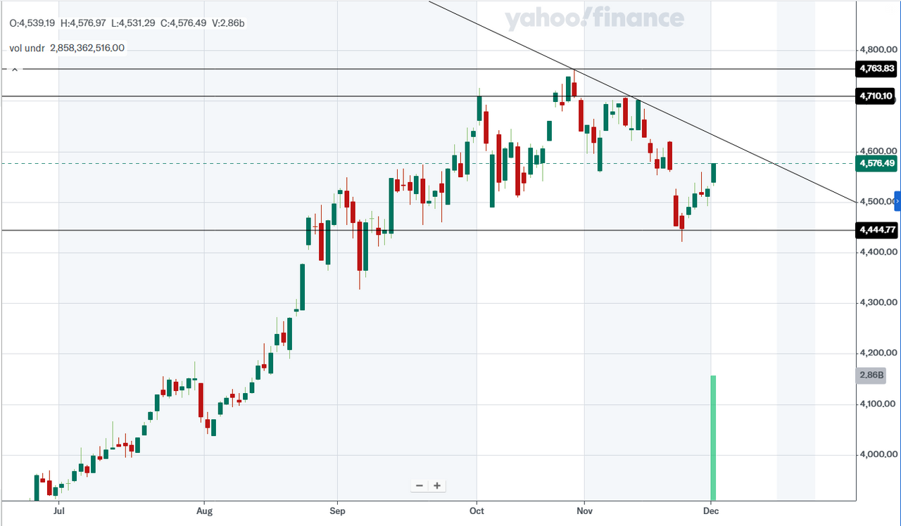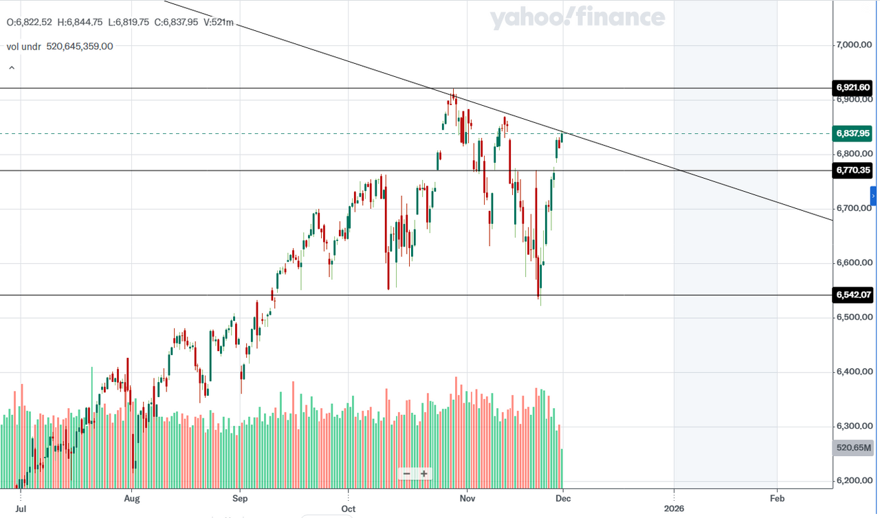 Фондовые индексы США завершили пятницу ростом: S&P 500 вырос на 0,54% до уровня в 6849,09 п. Nasdaq Composite увеличился на 0,65% до 23 365,69 п. Dow Jones Industrial Average вырос на 0,61% до 47 716,42 п. На прошлой неделе американский рынок акций показал сильный рост. В целом ноябрь был волатильным месяцем — под давлением оказались переоцененные акции из сектора искусственного интеллекта. В ноябре S&P 500 и Dow завершили месяц около нулевой отметки, тогда как Nasdaq потерял 1,5%, прервав семимесячный рост. Несмотря на это, к концу месяца настроения улучшились за счет ожиданий снижения ставки ФРС, что спровоцировало ралли на рынках.
