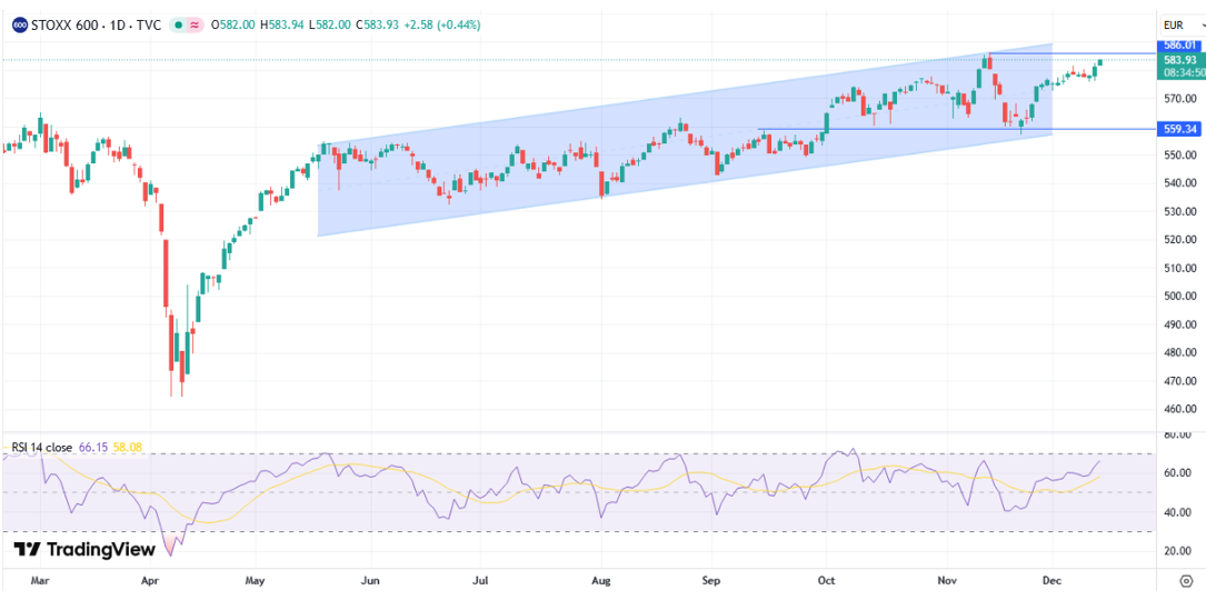 STOXX Europe 600 Индекс STOXX 600 остается в восходящем коридоре и подходит к максимальным значениям в районе 585 пунктов, где находится уровень сопротивления. Уровень поддержки образовался около 560 пунктов.