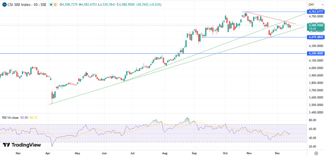 CSI 300 Индекс CSI 300 остается выше линии среднесрочного восходящего тренда. При этом видны признаки перехода к консолидации в широком диапазоне между 4420 и 4770 пунктов.