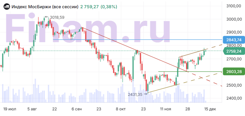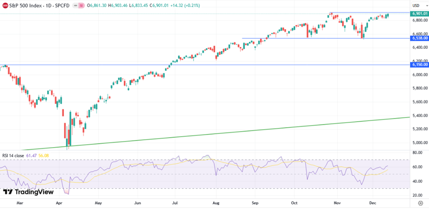 S&P 500 Индекс S&P 500 снова приблизился к историческому максимуму. Если он сумеет подняться выше него, это может стать стартом для «ралли Санта Клауса». В противном случае можно ожидать перехода к консолидации в диапазоне между 6600 и 6900 пунктами.