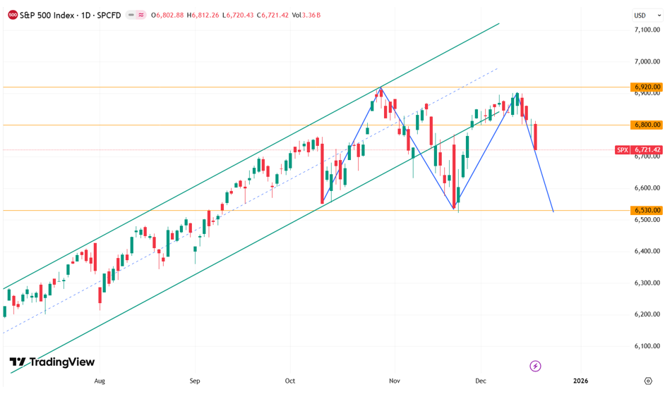 S&P 500 С технической точки зрения на дневном графике индекс S&P 500 формирует фигуру «двойная вершина», что указывает на риск развития коррекции. Ближайшей поддержкой выступает уровень 6530. Возврат к бычьему сценарию станет возможен при уверенном пробое сопротивления на 6800 пунктов.