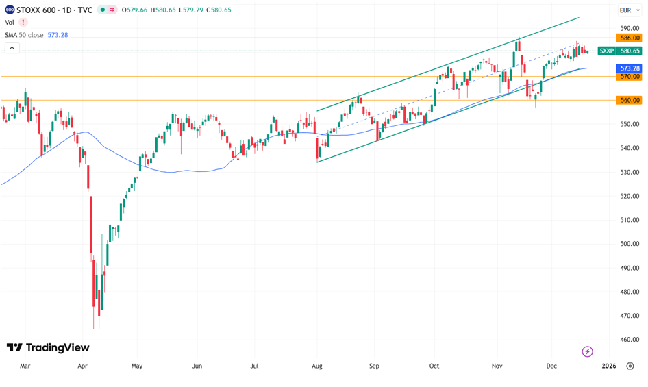 Euro STOXX 600 Индекс Stoxx 600 продолжает двигаться в рамках восходящего среднесрочного канала. Ключевой поддержкой выступает линия 50-дневной скользящей средней, проходящая рядом с нижней границей канала. Пробой этого уровня станет сигналом к переходу в фазу консолидации и стагнации в диапазоне 570–586 пунктов. Пока индекс удерживается выше, сохраняется потенциал для развития восходящего движения.