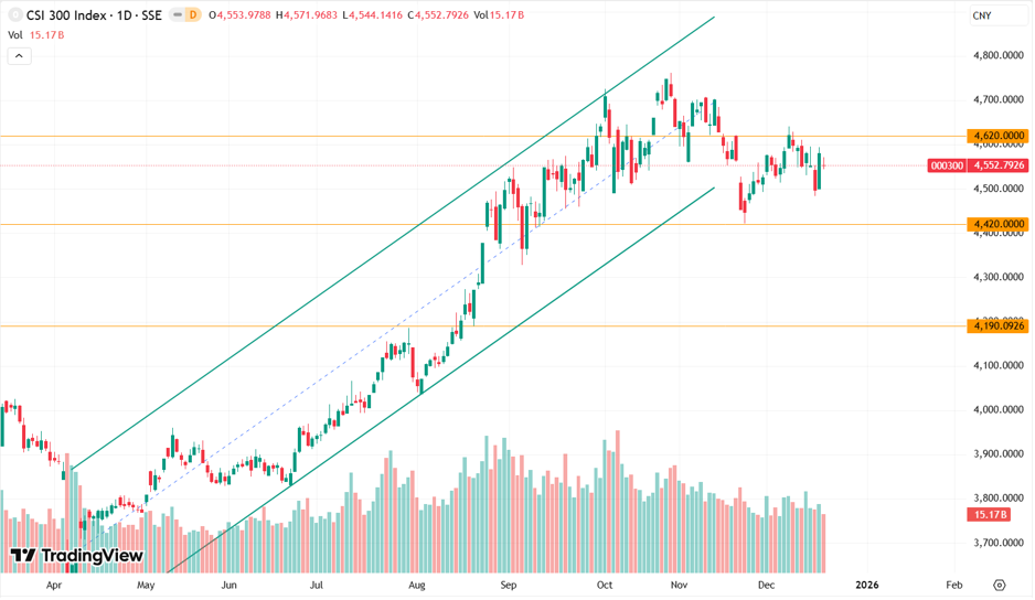 CSI 300 Индекс CSI 300 на последней торговой сессии столкнулся с сильным сопротивлением при попытке роста, что указывает на усиление консолидации в диапазоне 4420–4620 пунктов.