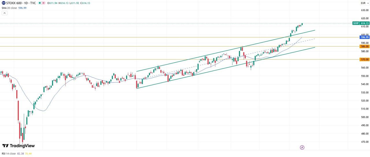 Euro STOXX 600 Индекс STOXX 600 торгуется на рекордных уровнях (614 пунктов). Индекс RSI в зоне сильной перекупленности >80, однако прочие технические индикаторы (ATR, MACD) не говорят о скором развороте бенчмарка вниз. Сигналом к коррекции может стать рост индекса уже на сокращенных объемах, в этом случае поддержка ожидается на уровне 597 пунктов, вблизи 50 дневной скользящей средней.