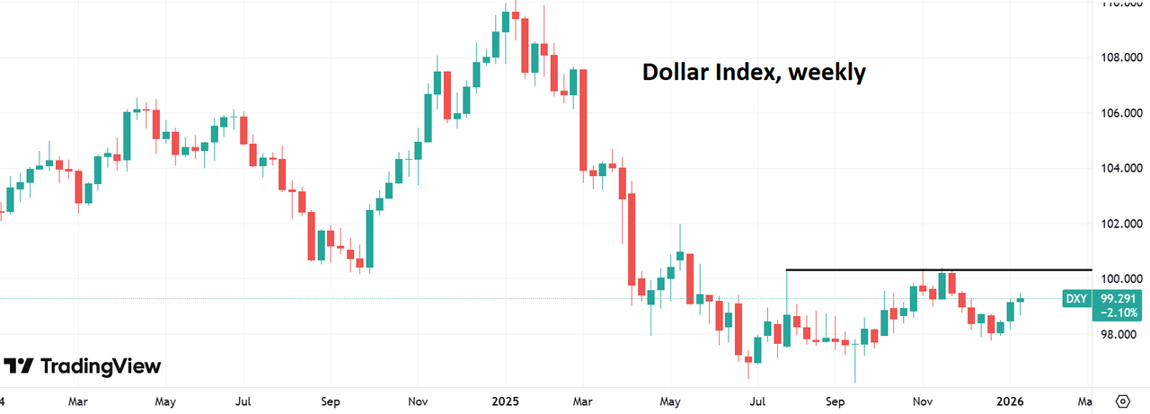 В четверг индекс доллара сумел преодолеть ближайшее сопротивление на 99,2 и в пятницу утром торги идут в районе 99,38. Похоже, что DXY третью неделю подряд зафиксирует подъем, поскольку неплохие данные по экономике США, вышедшие на этой неделе, снизили ожидания дальнейшего смягчения ДКП от ФРС. Курс евро на этом фоне сейчас опустился до 1,16 — это минимальный уровень с начала декабря прошлого года. Британский фунт на этой неделе также видимо зафиксирует небольшое снижение (GBP/USD 1,337). Курс японской иены этим утром немного укрепляется к доллару (USD/JPY 158,1; -0,26%). Позиции китайской валюты к пятнице остаются сильными (USD/CNY 6,976) и недельное усиление к доллару может составить около 0,15%. Это будет уже восьмая неделя непрерывного роста курса юаня. В конце этой недели индекс доллара переписал месячные максимумы, побывав на отметке 99,49 — это самый высокий уровень примерно за семь недель. Вчерашнее усиление курса доллара стало возможным на фоне публикации оперативных данных по рынку труда США, которые оказались лучше ожиданий. Эта статистика подтвердила мнение о том, что экономика США остается устойчивой, что снижает давление на Федеральную Резервную Систему в части оперативного снижения процентных ставок. Плюс к этому, премии за политический риск ослабли после того, как президент Д. Трамп выбрал более мягкий путь в отношении Ирана и подтвердил, что у него нет планов быстрой отставки главы ФРС Дж.Пауэлла. Вышедший вчера индекс деловой активности в производственном секторе штата Нью-Йорк (NY Empire State Manufacturing Index) в США подскочил в январе до 7,7 с пересмотренного значения -3,7 в декабре, превзойдя прогноз подъема до 1. Первичные заявки на пособие по безработице в США за прошедшую неделю снизились до 9 тыс по сравнению с предыдущей неделей, составив 198 тыс, хотя прогнозировался рост до 215 тыс. Текущие уровни этого показателя самые низкие за два года. Число вторичных заявок на получение пособий снизилось на 19 тыс до 1 884 тыс к концу года, что соответствует ожиданиям рынка. Эти результаты говорят, что в США по-прежнему низкий уровень увольнений, но правда и относительно низкий уровень найма. Несколько представителей ФРС, выступавших на этой неделе также отметили признаки стабильности рынка труда и предостерегли от потенциальных инфляционных рисков. В такой ситуации участники рынка ожидают, что в конце этого месяца ФРС сохранит свои ставки без изменений, а прогнозы на следующее снижение ставок теперь отложены, как минимум до июня. Это тот фактор, который сейчас придает сил доллару. Что касается ситуации в еврозоне, то здесь вчера вышли предварительные оценки по динамике ВВП Германии за весь 2025 год. Они показали подъем на 0,2%, против сокращения на 0,5% в 2024 году. Этот рост ВВП ведущей экономики еврозоны ознаменовал конец двухлетнего периода экономического спада, в основном поддержанного ростом потребления домохозяйств и государственных расходов. Однако экспорт слабеет на фоне повышения американских тарифов и значительного усиления конкуренции со стороны Китая. Инвестиции остаются слабыми: по сравнению с предыдущим годом сократилось накопление основного капитала в машиностроении, производстве оборудования и строительстве. Уточненная статистика DESTATIS по динамике инфляции в Германии показала, что в декабре она опустилась ниже таргета ЕЦБ: 1,8% г/г против 2,3% месяце