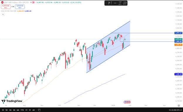 Фондовые индексы США закончили пятницу разнонаправленно: S&P 500 вырос на 0,03% до уровня в 6915,61 п., Nasdaq Composite — на 0,28% до 23 501,24 п. Dow Jones Industrial Average снизился на 0,58% до 49 098,71 п. Сегодня фьючерсы на данные индексы снижаются. На этой неделе инвесторы ожидают отчетность ряда компаний, а также заседание ФРС. Прошлая неделя для Уолл-стрит оказалась негативной: S&P 500 снизился примерно на 0,4%, зафиксировав второе подряд недельное падение. Давление на рынки оказывали геополитические риски, хотя к концу недели напряженность частично спала после заявлений Дональда Трампа о достижении «частичного соглашения» по вопросу Гренландии.