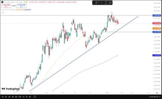 Китайский индекс CSI300 протестировал уровень сопротивления в районе 4790,7 п. и начал коррекцию. Поддержкой станет наклонная линия тренда в районе 4645 п.