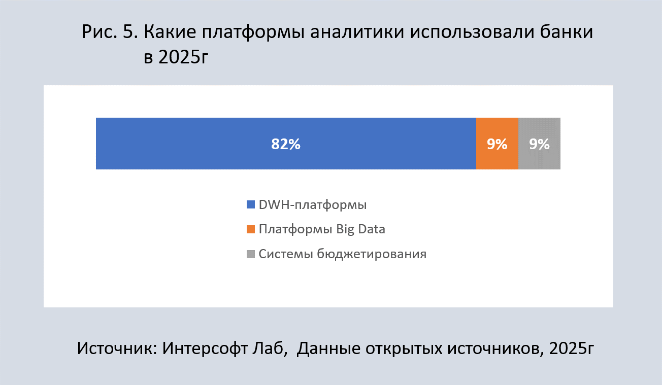 Банки преимущественно развертывали платформы хранилищ данных (82% проекта). Крупнейшие финансовые учреждения для автоматизации аналитических задач внедряли также платформы больших данных (9% проектов), см. Рис. 5.