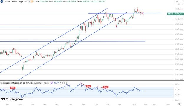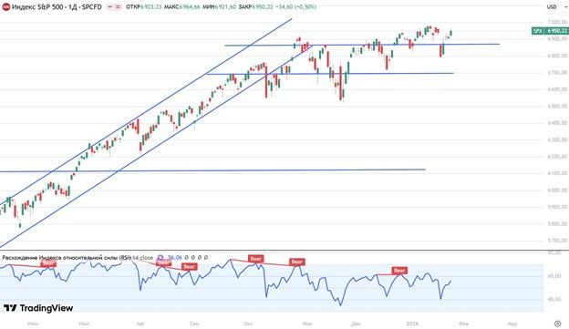 Американские индексы в понедельник закрылись ростом, рынки продолжают находиться вблизи локальных максимумов. Инвесторы ждут хороших квартальных отчетов крупных технологических компаний и решения ФРС по процентным ставкам, что создает позитивный настрой на рынках — S&P 500: +0,50% до 6950, Dow Jones: +0,64% до 49 412, Nasdaq Composite: +0,43% до 23 601. Во вторник фьючерс на S&P 500 торгуется в +0,34%, инвесторы ждут основной сессии в США, а рынки металлов сегодня показывают коррекцию от вчерашних исторических максимумов. Европейские фондовые рынки открылись ростом из-за эхо-поддержки с американского рынка, укрепления сырьевых и горнорудных бумаг (как ответ на рост благородных металлов) и позитивной корпоративной отчетности — при этом инвесторы также ждут итогов заседания ФРС, что сдерживает риск-аппетит, но не мешает отскоку после недавней коррекции. Британский FTSE 100 вырос на +0,29% до 10 178,15. Французский CAC 40 прибавил +0,22% до 8148,79 — французский рынок растет под влиянием общего европейского подъема и позитивных ожиданий по торговым соглашениям. Немецкий индекс DAX немного растет на +0,15% до 24 988,13 без особенного новостного фона. Общеевропейский индекс Euro Stoxx 50 вырос на 0,30% до 5975,56 на фоне улучшения глобальных настроений после роста американских рынков и умеренно позитивных ожиданий по денежно-кредитной политике ведущих центробанков. Ралли в металлах сегодня дает коррекцию: золото теряет 0,03%, серебро теряет 2,84%, а палладий корректируется на 6,36%. Азиатские фондовые рынки преимущественно растут во вторник, несмотря на заявление Дональда Трампа о введении 25% пошлин против Южной Кореи, однако это пока не подтверждено. Китай (FTSE China 50/ Hang Seng), индексы растут: FTSE China 50 +0,2%, Hang Seng +1,14% — главным драйвером стало опубликованное увеличение совокупной прибыли крупных промышленных компаний Китая за год на +0,6% (в декабре рост +5,3% после падения в ноябре). Это поддержало оптимизм по восстановлению промышленной активности и привело к росту бумаг финансово-страховых и технологических эмитентов (например, China Life, AIA, Alibaba), несмотря на отдельные просадки у некоторых компаний. В сумме новости о прибыли и эхо роста американского рынка подтолкнули покупателей. в Гонконге лидерами роста стали China Life Insurance (+4,7%), AIA Group (+3,4%), Techtronic Industries (+3%), CSPC Pharmaceutical Group (+2,7%), Ping An Insurance (+2,3%) и Alibaba Group Holding (+2%). В то же время под давлением остаются Hang Lung Properties (-4,8%), Hansoh Pharmaceutical Group (-4,3%), JD.com (-2,5%) и Netease (-1,3%), что отражает избирательный характер покупок. Континентальный рынок: индекс CSI фактически почти не изменился (-0,04%), то есть остался в боковом диапазоне — инвесторы сохраняют осторожность на фоне усиления макроэкономических рисков и неопределенности во внешней торговле — рынки закладывают в цены возможность введения новых торговых мер со стороны администрации Дональда Трампа, что может усилить давление на экспорт и промышленный сектор. Япония (Nikkei 225): +0,7% — рост поддержали сильные движения в промышленном и техсекторе, лидеры дня (Resonac, Advantest, Sumitomo Metal Mining и др.) подорожали на несколько процентов, что отражает спрос на акции производителей компонентов и оборудования. Одновременно ряд крупных бумаг падали, причиной могут быть пошлины на Корею, японские инвесторы боятся повторения корейских пошлин уже на японском рынке. Лидером сессии стали акции Resonac Holdings (+6,1%), также заметно подорожали Advantest (+5,2%), Sumitomo Metal Mining (+4,2%), Nissui Corp. (+4,2%), Yas