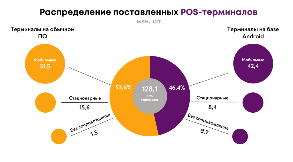 По результатам структуры продаж, категория традиционных терминалов по-прежнему лидирует, составляя 53,6 % от всех проданных платежных устройств. Однако, в 2024 году продолжается тенденция на рост популярности POS-терминалов на базе Android, как и в прошлом году.