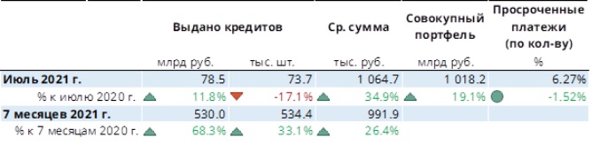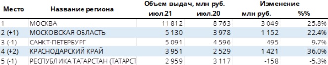 Объем выдачи: за 7 месяцев 2021 года выдано 534.4 тыс. автокредитов (+33.1% к 7 месяцам 2020 г.) на 530.0 млрд руб. (+68.3%). Средний чек: средняя сумма автокредита по итогам июля 2021 года составила 1 064.7 тыс. руб. (+34.9% по сравнению с июлем 2020 г.). Совокупный портфель: портфель автокредитов по итогам июля 2021 г. достиг 1 018.2 млрд руб. (+19.1% к июлю 2020 г.). Уровень риска: уровень риска портфеля автокредитов сохраняется на стабильно среднем и приемлемом для данного вида кредитов уровне: уровень просроченных более 90 дней кредитов в целом по автокредитам на конец июля снизился до 6.27% (на 1.52 п.п. ниже уровня на 31.07.2020 г.). Средний срок: средний срок выдаваемого автокредита по итогам июля 2021 составляет 59.9 месяцев (+15.6% к июлю 2020 г.). Топ-5 регионов по объему выдачи: