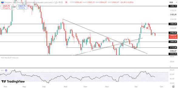 В понедельник, 25 августа, мировые фондовые индексы показывают бычью динамику. Джером Пауэлл, выступая на экономическом симпозиуме в Джексон-Хоуле в пятницу, где традиционно встречаются руководители крупнейших мировых центробанков, подчеркнул увеличение рисков для рынка труда в США. Он заявил, что изменение баланса рисков в экономике может вынудить ФРС скорректировать свою денежно-кредитную политику. По мнению экспертов, Пауэлл озвучил именно те сигналы, которых ожидал рынок. Учитывая текущие заявления, мы считаем, что вероятность снижения ключевой ставки на заседании ФРС в сентябре существенно выросла. Согласно CME Group, вероятность снижения ставки на 25 б.п. составляет 87%, когда месяц назад была 62%. Тем не менее мы видим потенциальный негатив для рынка в среднесрочной перспективе, ведь слабость рынка труда говорит о слабости в экономике, что может отразиться на рисковых активах. По состоянию на 12:00 мск европейский STOXX 600 снижается на 0,3%, а фьючерс на S&P 500 — на 0,2%. Доходность 10-летних казначейских облигаций США растет на 1 б.п. и составляет 4,273%. Китайский CSI 300 вырос на 2,1%, а гонконгский Hang Seng — на 1,9%. Фьючерсы на нефть Brent растут на 0,3%. Индексы МосБиржи и долларовый РТС снижаются на 0,9%. Акции Zoom Communications выросли на 12,7% после того, как скорректированная прибыль и выручка за второй квартал превзошли рыночные ожидания, а также благодаря улучшению годовых прогнозов компании. Акции Intuit снизились на 5%. Несмотря на квартальные результаты выше прогнозов, ожидания по первому кварталу оказались хуже ожиданий инвесторов. Бумаги Nvidia, чьи акции входят в стратегию «US. Сбалансированная», прибавили 1,7%: компания ведет переговоры с властями США о разрешении на экспорт новых передовых чипов в Китай, сообщил глава Nvidia Дженсен Хуан. Азиатские рынки выросли вслед за западными на фоне заявлений Джерома Пауэлла в Джексон-Хоул. Список лидеров роста в составе Hang Seng возглавляют бумаги Zijin Mining Group, дорожающие на 6,4%. Рыночная стоимость Baidu увеличивается на 6,3%, Longfor Group — на 5,2%, Netease — на 6,0%, Alibaba — на 5,5%. На российском рынке главным двигателем котировок продолжает быть непредсказуемая геополитика. Уже вторую неделю поступают противоречивые новости с обеих сторон. Более недели назад после разговора Трампа и Путина состоялся разговор лидеров США, ЕС и Украины, где была выражена готовность к компромиссу для урегулирования конфликта. Однако сейчас поступают новости, что страны запада одобряют новые поставки вооружения Украине, что оттягивает переговорный процесс. Мы рекомендуем игнорировать непредсказуемую геополитику до появления конкретных фактов, а не просто обещаний. Лучше фокусироваться на более определенных вещах, таких как потенциальное снижение ключевой ставки на ближайшем заседании ЦБ 12 сентября. Согласно макроэкономическим данным, а именно снижению инфляционного давления и замедлению экономики, мы ожидаем продолжения смягчения ДКП в России, что поддержит российский рынок акций. Мы ожидаем снижения ключевой ставки на 1 п.п. на ближайшем заседании. Среди лидеров роста сегодня: ПИК (+1,8%), «Позитив» (+1,3%), «Россети» (+0,9%). В лидерах снижения: «СПб Биржа» (-5,1%), МТС (-2,7%), «Аэрофлот» (-2,6%). Техническая картина Индекс МосБиржи На текущей неделе будет момент истины для российского рынка акций. При закрытии месяца выше 2900 пунктов, возможно продолжение роста рынка. При 