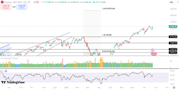 S&P 500 Индекс пытается обновить исторический максимум. При закрытии двух дней выше этого уровня, возможен рост до уровня 6955 пунктов (уровень 1,618 по линейке Фибоначчи).