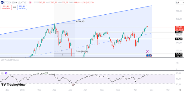 Euro STOXX 600 STOXX 600 закрепился выше уровня 553 пункта. При пробитии исторического максимума 564 пункта, возможен рост до верхней границы глобального восходящего канала (585 пунктов).