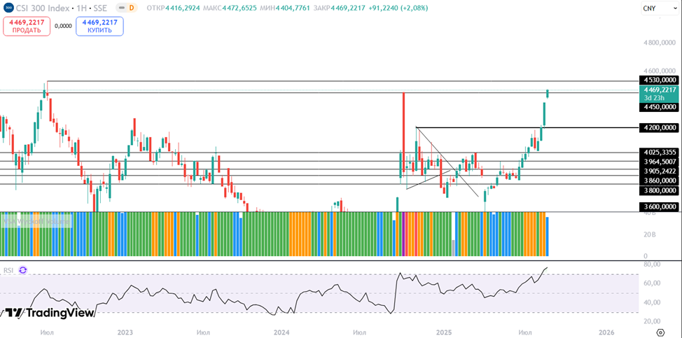 CSI 300 Индекс достиг обозначенного нами уровня 4450 пунктов. Возможен рост до 4530 пунктов, после чего очень вероятен откат для снятия перекупленности по RSI и закрытия гэпа на уровне 4385-4400 пунктов.