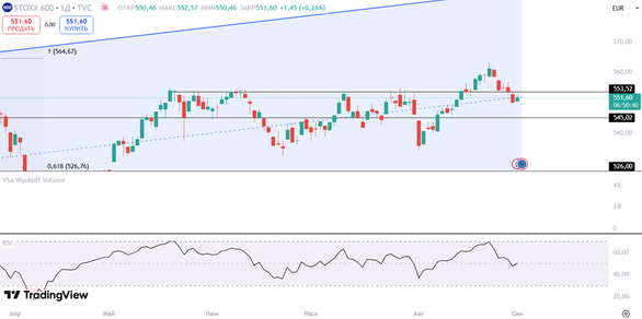 Euro STOXX 600 STOXX 600 вновь перешел к боковому движению. При закрытии дня ниже уровня 553 пункта, возможно снижение до 545 пунктов.