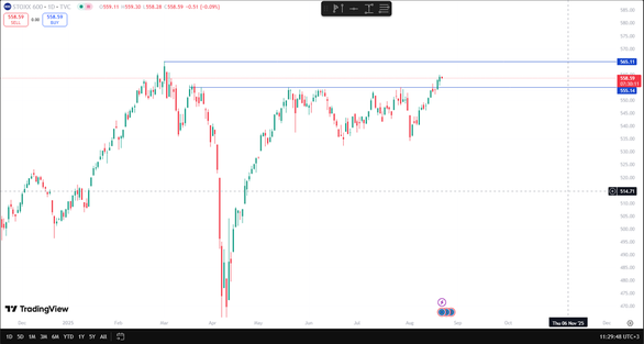 Euro STOXX 600 Европейский индекс STOXX600 пробил уровень сопротивления в 555,14 п. Следующим таргетом может стать уровень сопротивления в 565,11 п.