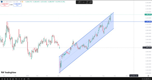 CSI 300 Китайский индекс CSI300 продолжает движение в восходящем канале. Цена подошла к верхней границе в 4288 п. Сейчас цена может протестировать зеркальный уровень поддержки в 4194,9 п.