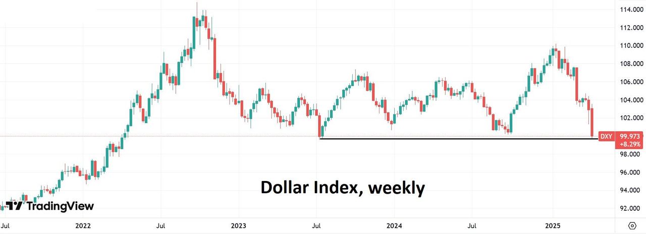 Американская валюта остается заложником той неразумной политики, которую стал проводить Д. Трамп за последние пару месяцев. В середине недели Трамп внезапно приостановил введение более высоких тарифных ставок для ключевых торговых партнеров США, но доллар пока продолжает инерционное движение вниз. В том числе и по причине резкого снижения инфляции в США. Этим утром он побывал на отметке 99,8 – минимум с июля 2023 г. На этом фоне курс евро подскочил выше 1,13. Британский фунт опять восстановился до 1,31 к доллару. Пара USD/JPY (143,0) сейчас переписывает полугодовые минимумы. Даже китайский юань за последние сутки несколько укрепил свои позиции до 7,32. На фоне ослабления доллара швейцарский франк на этой неделе показывает самый стремительный рост (+4,4%). СМИ сообщают, что одной из причин решения Д. Трампа о приостановке на 90 дней «взаимных» пошлин могли стать опасения министра финансов США Скотта Бессента по поводу потрясений на рынке гособлигаций, поскольку быстрый рост их доходности, в случае продолжения, мог бы стать триггером для финансового коллапса.