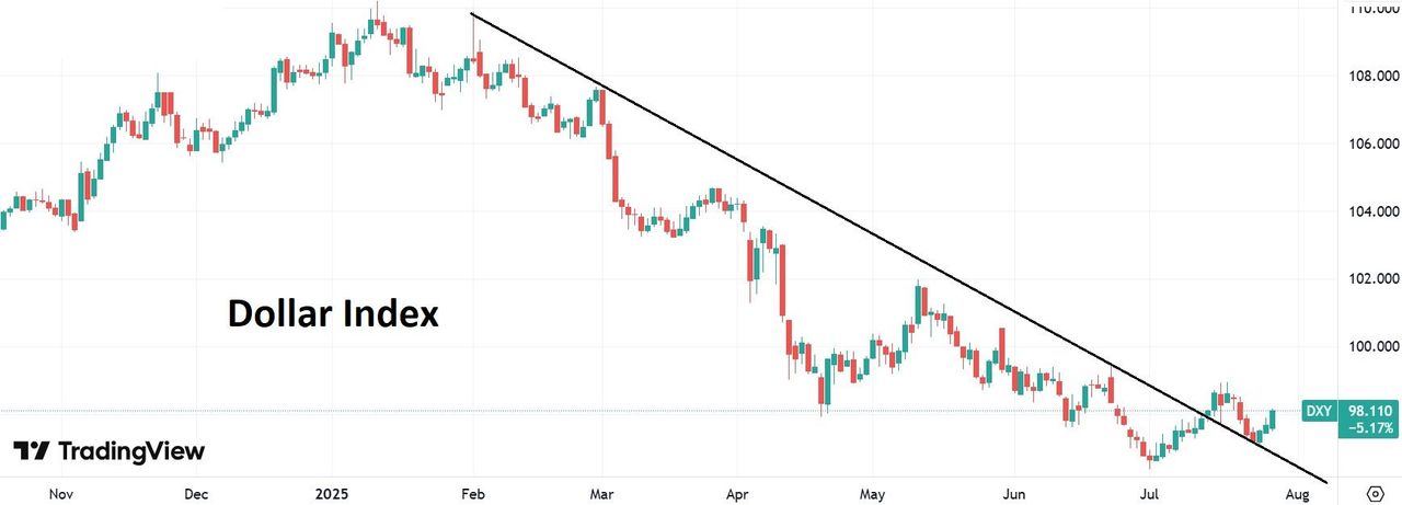 Европейские и американские фондовые рынки открылись в понедельник на позитиве после того, как в выходные стало известно, что США и ЕС достигли торгового соглашения. Курс евро на эту новость в понедельник реагирует локальным ослаблением (EUR/USD 1,168, -0,5%). Соответственно курс доллара сегодня немного растет (DXY 98,11, +0,5%). Британский фунт этим утром продолжает смотреть вниз (GBP/USD 1,341), в сторону месячных минимумов к доллару. Китайский юань в начале недели слабеет: пара USD/CNY сейчас восстановилась до 7,175, против минимума прошлой недели на 7,15. На встрече в Шотландии в воскресенье президент США Дональд Трамп и председатель Европейской комиссии Урсула фон дер Ляйен заявили о заключении торгового соглашения, которое предусматривает 15% импортный тариф на товары из ЕС, что вдвое меньше ставки (30%), которую Трамп угрожал ввести с 1 августа. Эта ставка (15%) будет включать в себя автомобили и фармацевтику. Как видим, европейцам удалось снизить тариф на авто с 27,5% до 15% то есть до уровня Японии. Экспорт стали и алюминия из ЕС по-прежнему облагается 50% пошлинами. В дальнейшем Брюссель надеется смягчить условия в последующих переговорах с США и добиться частичного улучшения квот. ЕС также согласился инвестировать $600 млрд в экономику США. Но поскольку здесь не указаны сроки и конкретные объекты, то это больше напоминает декларацию о намерениях. Но если это будет реализовано, то можно ждать ухода капитала из Европы в пользу Америки, что в целом может укрепить доллар по отношению к евро. ЕС также собирается заменить нефть и газ из России американским топливом в рамках этого торгового соглашения. ЕС пообещал покупать сжиженный природный газ (СПГ) в США на сумму $250 млрд в год в течение трех лет на общую сумму $750 млрд и переходить на американское ядерное топливо. Также европейцы обещали открыть для американских компаний доступ к своим рынкам по нулевым пошлинам и увеличить закупки американской военной техники. Судя по реакции валютного рынка, Америка больше выигрывает от этого торгового соглашения с ЕС: доллар крепнет против евро. Европейский бизнес может быть недоволен новыми правилами игры, особенно немецкий. Америка получила все, что хотела, а выгоды Европы от этого соглашения весьма сомнительны. Тем не менее, соглашение между США и ЕС внесет ясность в ситуацию для компаний и предотвращает более масштабную торговую войну между двумя союзниками, на долю которых приходится почти треть мировой торговли. Данные по США, опубликованные в пятницу показали, что объем заказов на товары длительного пользования в июне рухнул на 9,3% по сравнению с предыдущим месяцем - до $311,84 млрд. Это самое существенное падение с апреля 2020 г. Ожидалось сокращение на 10,8-11,1%. Причина такой слабой динамики – резкое уменьшение спроса на транспортное оборудование (-22,4%), в том числе на гражданские самолеты (-51,8%). В июне объем заказов без учета самолетов и военного оборудования – индикатор капиталовложений бизнеса, сократился на 0,7%, хотя ожидалось повышение на 0,2%. Ожидается, что на этой неделе ФРС и Банк Японии сохранят ставки на прежних уровнях, но трейдеры будут следить за последующими комментариями, чтобы оценить сроки дальнейших действий. Что касается Европы, то здесь в пятницу вышел индекс делового климата Ifo в Германии, который в июле вырос до 88,6 с 88,4 в июне, что является самым высоким пок