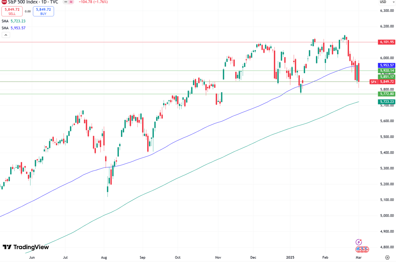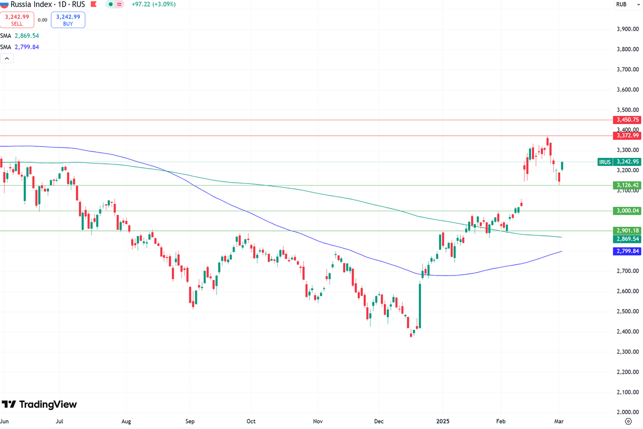 В понедельник американские фондовые индексы закрылись в «красной зоне». Рынки до последнего надеялись, что импортные тарифы в отношении Мексики и Канады введены не будут, однако Дональд Трамп подтвердил, что с сегодняшнего дня ограничения начинают действовать. Пошлины на китайские товары были увеличены с 10 до 20%. Также на настроения инвесторов влияли неоднозначные данные по динамике индекса деловой активности (PMI). PMI в производственном секторе, по оценкам S&P Global, в феврале вырос до 52,7 п., опередив прогноз. Однако ISM оценивает производственный PMI в 50,3 п., что означает снижение относительно январских уровней. S&P 500 опустился на 1,76% до 5849,7 пункта, технологический Nasdaq Composite – на 2,64% до 18 350 пунктов, индекс голубых фишек Dow Jones Industrial Average – на 1,48% до 43 191 пункта. Акции Apple, входящие в состав стратегии «US. Сбалансированная», снизились на 1,58%. Капитализация Super Micro Computer рухнула на 13% после сообщений о том, что серверы, поставляемые компанией и Dell Technologies (-7,01%) и потенциально содержащие чипы Nvidia (-8,69%), связаны с делом о мошенничестве в Сингапуре. Котировки Verizon повысились на 1,79% после того, как в воскресенье компания Lockheed Martin заявила, что начинает сотрудничество с Nokia и Verizon, чтобы включить технологию 5G от Nokia в свою собственную систему 5G. Акции Intel в начале торговой сессии росли более чем на 3%, однако к закрытию упали на 4,17%. Reuters сообщил о том, что разработчики чипов Nvidia и Broadcom проводят испытания производственного процесса Intel 18A. Бумаги Chipotle Mexican Grill подросли на 0,67% после того, как Morgan Stanley повысил рейтинг акций ресторатора до «Лучше рынка» с «На уровне рынка», а целевую цену увеличил до $65. Европейские рынки начали вторник снижением: STOXX 600 теряет 0,86%. Лидируют в составе индекса бумаги Abrdn (+10,5%), Thales (+9,44%), Nel (+5,89%). Сильнее других снижаются акции Continental (-8,48%), Fresenius Medical Care (-7,93%) и Forvia (-7,41%). Азиатские рынки демонстрировали разнонаправленную динамику. Hang Seng опустился на 0,17%, Nikkei – на 1,20%, однако SSE подрос на 0,22%. На гонконгском рынке сильнее остальных росли бумаги Chow Tai Fook Jewellery (+5,28%), Tingyi (+4,98%) и Budweiser Brewing (+4,62%). Сильнее остальных снижались BYD (-6,77%), Geely (-5,92%) и Hang Seng Bank (-3,64%). Российский рынок начал вторник резким ростом. По состоянию на 11:20 мск Индекс МосБиржи увеличивается на 2,67% до 3229,1 пункта. В составе индекса лучше других растут бумаги «Яндекса» (+3,53%), «Самолета» (+3,43%) и «Совкомбанка» (+3,41%). Снижаются в составе индекса только «префы» «Сургутнефтегаза» (-0,04%). В центре внимания инвесторов снова геополитика. Вчера Reuters сообщил, что США разрабатывают план потенциального смягчения санкций против России. Администрация Трампа поручила подготовить список ограничений, которые могут быть смягчены, чтобы официальные лица США могли обсудить его с представителями РФ в ближайшие дни. Техническая картина Индекс МосБиржи Индекс МосБиржи оттолкнулся от поддержки вблизи 3126 п. и перешел к росту. Ближайшей целью выступает отметка 3372 п. – максимум, установленный 25 февраля.