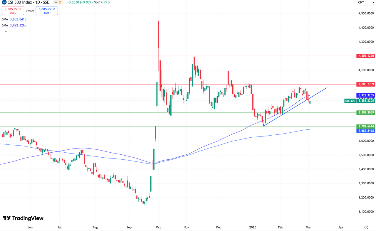 CSI 300 Китайский рынок упал, пробив восходящий тренд и опустившись ниже SMA 100. Пока неясно, вернется ли индекс снова к росту (цель 4000 п.) или продолжит снижаться. Потенциальная коррекция может опустить бенчмарк к отметкам 3840 и 3800 п.
