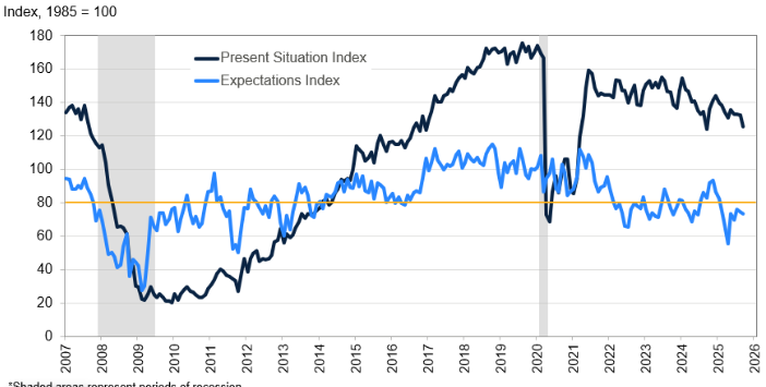Индекс доллара (DXY) снизился на вчерашней торговой сессии на 0,14%. Сегодня движение вниз продолжилось – индекс снижается ещё приблизительно на 0,13% и в моменте DXY опускался до отметки 97,5. Статистика вчера оказалась преимущественно разочаровывающей. Индекс менеджеров по закупкам в Чикаго снизился до 40,6 п. Рынок при этом ожидал, что индекс в сентябре составит 43,4 п. Снижение индекса наблюдается уже второй месяц подряд. Индекс остаётся ниже отметки 50 п. на протяжении последних 22 месяцев. ISM отмечает, что снижение было обусловлено очередным резким падением объёма новых заказов, а также снижением объёмов поставок от поставщиков и занятости. Эта динамика была частично компенсирована ростом объёмов производства и портфеля заказов. Conference Board также не порадовал трейдеров и сообщил, что индекс потребительской уверенности опустился до отметки 94,2 п. Главный экономист CB отмечает: компонент текущей ситуации зафиксировал самое большое падение за год. Оценка потребителями условий ведения бизнеса была гораздо менее позитивной, чем в последние месяцы, в то время как их оценка текущей доступности работы снизилась девятый месяц подряд, достигнув нового многолетнего минимума. Это согласуется с сокращением числа вакансий. Ожидания также снизились в сентябре, но в меньшей степени. Потребители были немного более пессимистичны в отношении будущей доступности работы и будущих условий ведения бизнеса, но оптимизм в отношении будущих доходов вырос, что смягчило общее снижение индекса ожиданий.