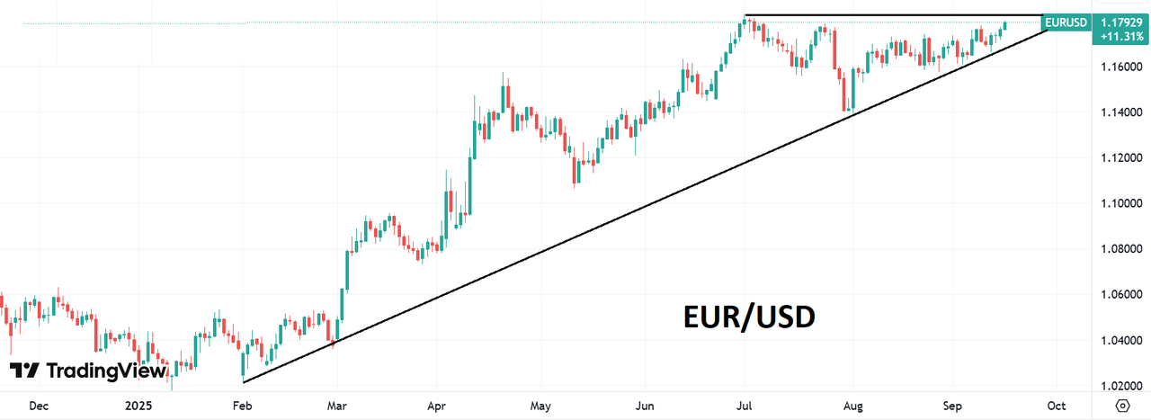 Растущие ожидания смягчения денежно-кредитной политики ФРС весьма негативно сказываются на долларе, зато они поднимают американские фондовые индексы и цены на золото. Котировки драгметалла этим утром выросли до $3690/унц, обновив исторические максимумы. Так инвесторы закладываются на «мягкую» риторику руководства ФРС по итогам сентябрьского заседания. В конце прошлой недели доходность 10-летних казначейских облигаций США упала до 4,0% - это для доллара сейчас ключевой фактор слабости. В настоящее время рынки закладывают в цены общее снижение ставки по федеральным фондам на -70 б.п. к концу года до 3,63% с текущих 4,33%. В среду свой вердикт по ставке вынесет ФРС. В этой связи инвесторы будут внимательно следить за распределением голосов в Комитете по операциям на открытом рынке (FOMC). Накануне Сенат США проголосовал за включение в Совет управляющих ФРС Стивена Мирана, предложенного Дональдом Трампом. Он будет занимать место, освободившееся после отставки Адрианы Куглер и, вероятно, он сможет поучаствовать в заседании 16-17 сентября. При этом Миран остается председателем Совета экономических консультантов Белого дома. Это может привести к возможному сдвигу в сторону более мягкой денежно-кредитной политики и снижения ставок, при этом повысится политический контроль администрации Белого Дома над ФРС. Это фактор тоже не в пользу крепкого курса доллара. Когда индекс доллара слабый, его может подкосить любая негативная новость. Например, вчера американская валюта увеличила свои потери после выхода сентябрьского индекса условий ведения бизнеса, опубликованного компанией Empire, который упал сильнее, чем ожидалось. Индекс деловой активности в производственном секторе штата Нью-Йорк (New York Empire State Manufacturing Index) в сентябре снизился до -8,7, что является самым низким показателем за три месяца, по сравнению с 11,9 в августе и прогнозируемыми 5. Оптимизм бизнеса в отношении перспектив остается приглушенным, и ожидается, что уровень занятости останется на прежнем уровне в течение следующих шести месяцев. Индекс доллара сейчас торгуется вблизи своего ценового минимума 2025 года, неся потери около 9% в этом году. На этом фоне глобальные инвесторы хеджируют свои позиции в долларах. Интересно, что торговая война, развязанная Трампом, не отпугнула инвесторов от американских акций и облигаций, однако досталось самой американской валюте. Согласно оценке Deutsche Bank, впервые за 10 лет приток средств в ETF с хеджированием валютного риска, которые инвестируют в американские активы, превысил приток в фонды без хеджирования. На фоне ослабления доллара позиции евро остаются сильными (EUR/USD 1,1797). Вчера инвесторы проигнорировали новость о понижении кредитного рейтинга Франции агентством Fitch до уровня AA- из-за растущего долга правительства. Это решение не стало сюрпризом для рынков, просто фискальные проблемы Франции могут замедлить рост евро в краткосрочной перспективе, но не приведут к его значительному падению. Вчера стало известно, что положительное сальдо торгового баланса еврозоны сократилось в июле до 12,4 млрд евро, против 18,5 млрд евро годом ранее, что немного превысило рыночные ожидания в 11,7 млрд евро. Профицит с США сократился до 11,2 млрд евро с 16,0 млрд евро, поскольку наблюдался рост импорта (+11,3%) в сочетании со снижением экспорта (-4,5%) из-за влияния торговых тарифов. 