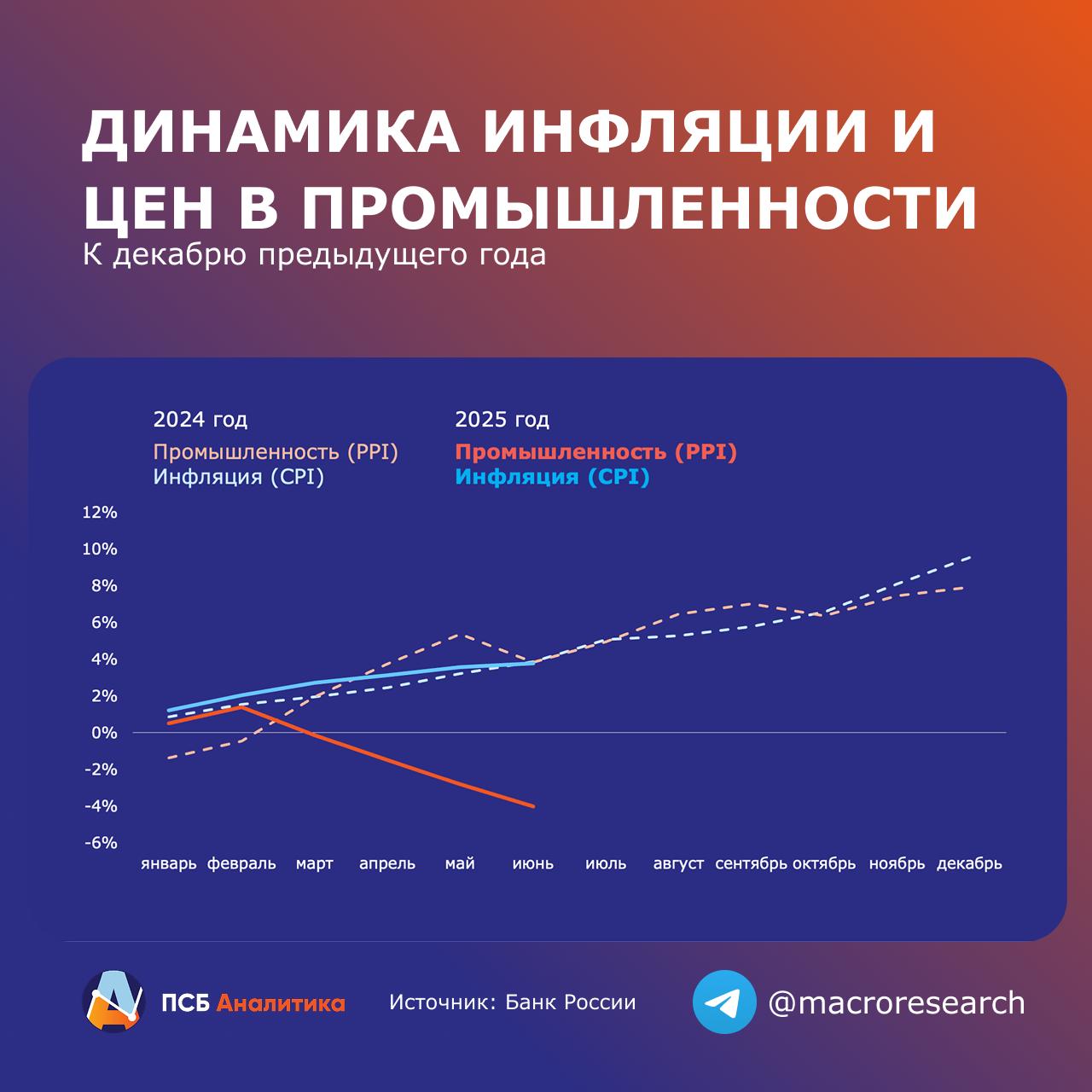 В промышленности уже можно говорить о дефляции — в июне четвертый месяц подряд снижаются цены (-1,3% м/м, как и в мае). За полугодие индекс цен производителей промышленной продукции упал на 4%. Основной драйвер дефляции — добыча, но и в обработке цены устойчиво снижаются. По данным ЦБ, ценовые ожидания предприятий промышленности продолжили падение и в июле (сейчас они на минимумах с середины 2023 г.).