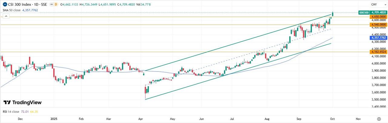 CSI 300. Индекс CSI 300 после пробоя сопротивления 4 540 перешёл в фазу ускоренного роста и закрепился выше уровня 4 650. На дневном графике сохраняется восходящий канал, техническая картина благоприятствует продолжению импульса в сторону 4 700–4 750. RSI находится в зоне перекупленности, что увеличивает вероятность локальной коррекции. Ближайшая поддержка для котировок в таком случае район 4 500–4 540, где, вероятно, активизируются “быки”. Краткосрочно возможна консолидация, но общая динамика остаётся позитивной.