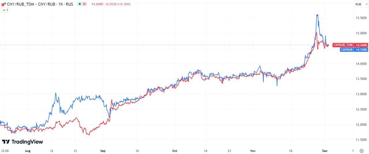 CNYRUB – 14.6258 В моменте фактически обнулился спред между офшором и внутренними курсами. Кросс-курс USDCNY 7.33 по официальным данным практически не отличается от внешнего. Несмотря на это, вряд ли пока можно говорить о каких-то фундаментальных факторах курсообразования. Перетоки между внешним и внутренним рынком остаются ограниченными. В этом плане ряд предложений по увеличению обязательной продажи выручки экспортерам не имеют на данный момент никакого практического смысла. Продажи юаня на бирже со стороны Банка России выросли до 8.3 млрд руб. в день. Внешне кажется не такой большой объем, но при постоянных продажах это достаточно значимая (стабилизирующая) величина для рынка, т.к. это 8-10% объёма торгов на бирже. Проблемой продолжат оставаться сложности с транзакциями оффшор-оншор, поэтому "качели" вряд ли закончены, курс сейчас скорее отражает локальный баланс, который может быстро меняться при новых перекосах спроса/предложения в моменте.