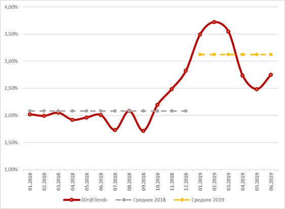 Объем выдачи кредитных карт за прошедшие 7 месяцев 2019 года превысил 350 млрд. руб. За аналогичный период 2018 года – немногим менее 250 млрд. руб., а в 2017 году ~165 млрд. руб. Максимальные объемы выдач кредитных карт, традиционно, приходятся на ноябрь – декабрь каждого, когда, с одной стороны, есть повышенный спрос со стороны потребителей, а, с другой стороны, - банки стараются выполнить годовые бизнес-планы по продаже кредитных продуктов. Так, в 2018 году в указанный период была выдана практически четверть от всех кредитных карт этого года, в 2017 – 23,4%. Такая высокая активность в выдаче кредитных карт не могла не сказаться на их кредитном качестве. Ранние индикаторы (просроченная задолженность 30+ на втором и третьем месяцах) начали сигнализировать о первых проблемах с выдач октября 2018 года и впоследствии риск нарастал, вплоть до июня 2019 года. Просроченная более 30 дней задолженность по картам, выданным в октябре 2018 года, составила 2,2%, а в ноябре и декабре – 2,5% и 2,8%, тогда как в среднем по всему 2018 году была на уровне 2,1%. Данный тренд не изменился и с наступлением 2019 года.