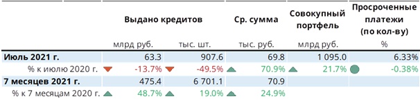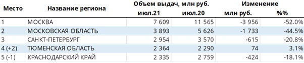 Объем выдачи: за 7 месяцев 2021 года выдано 6.7 млн кредитных карт (+19.0% к 7 месяцам 2020 г.) на 475.4 млрд руб. (+48.7%). Средний чек: средний лимит по кредитным картам увеличился и в среднем по итогам июля 2021 года составил 69.8 тыс. руб. (+70.9% к июлю 2020 г.). Совокупный портфель: портфель кредитных карт по итогам июля 2021 г. достиг 1 095.0 млрд руб. (+21.7% к июлю 2020 г.). Уровень риска: уровень риска портфеля кредитных карт (уровень просроченных более 90 дней кредитов) в целом на конец июля составил 6.33% (на 0.38 п.п. ниже уровня 31.07.2020 г.). Топ-5 регионов по объему выдачи: