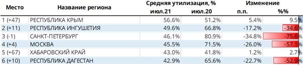 Топ-6 регионов по уровню средней утилизации: средняя утилизация по итогам июля 2021 года составляет 36.5% и отличается от аналогичного значения прошлого года на -8.2 п.п.