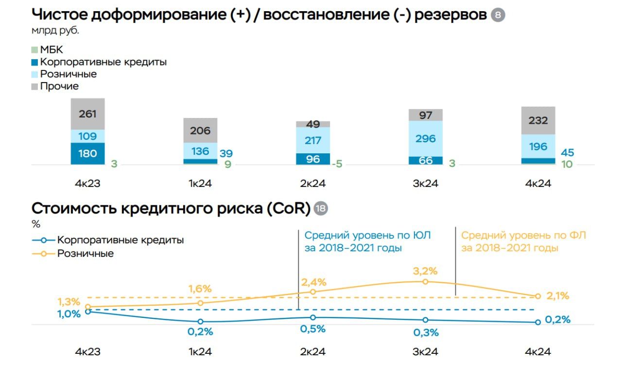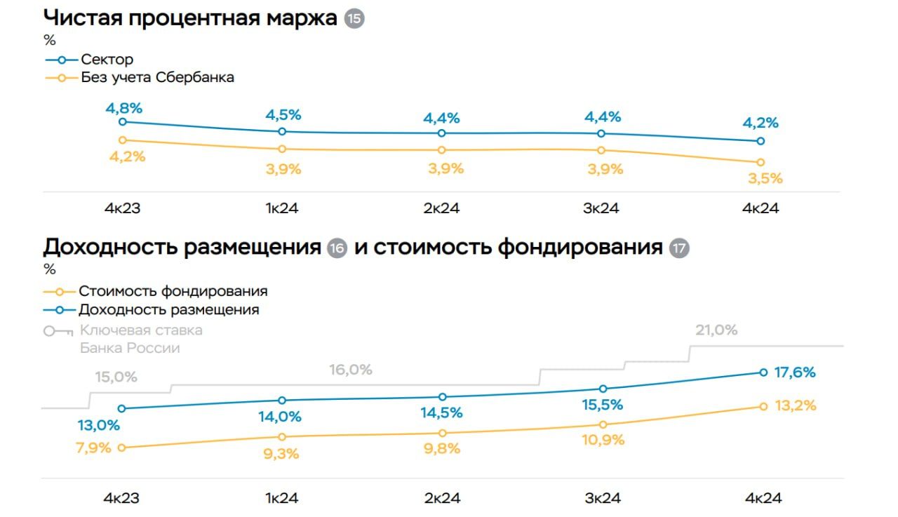 Банк России опубликовал квартальный обзор банковского сектора за 4 квартал и год. Чистая процентная маржа банков упала в 4 квартале с 4.4% до 4.2%, но это с учетом Сбера, без него она снижалась более резко с 3.9% до 3.5% и скорее всего будет оставаться под давлением на фоне реализации процентного риска. На фоне повышения ключевой ставки и жесткой конкуренции за пассивы из-за НКЛ, стоимость фондирования резко выросла с 10.9% до 13.2% (+2.3 п.п.), но и доходность размещения средств тоже выросла с 15.5% до 17.6% (+2.1 п.п.) – это примерно отражает среднюю ставку кредитования в экономике. Но стоит учитывать, что фактические средние ставки существенно ниже из-за больших объемов субсидированного кредита (~₽17 трлн), вклад которых может составлять 1.5-2 п.п., т.е. на самом деле в экономике эффективные средние ставки для компаний/населения около 16%, что сильно ниже ключевой ставки 21%. Банки сократили резервирование под потери в конце года, но Банк России ждет роста стоимости кредитного риска (CoR) с 2.3% до 2.5-2.9% - по рознице и 0.8-1.2% - по компаниям, скорее оптимистичная оценка, учитывая то, что стоимость кредита продолжит расти. В 4 квартале уже виден рост реструктуризации, хотя общие суммы пока небольшие (₽127 млрд). ОФЗ на балансах банков выросли с ₽12.66 трлн до ₽14.94, т.е. почти ₽2.3 трлн, при том, что чистое привлечение Минфина составило ₽2.5 трлн, в основном именно банки выкупали гособлигации, что приводило к росту денежной массы на соответствующую величину. Если смотреть в целом – то маржинальность снижается, кредитные риски должны подрасти на фоне достаточно больших и инерционно растущих процентных ставок в экономике и замедления роста кредита – это будет дополнительно ужесточать условия.