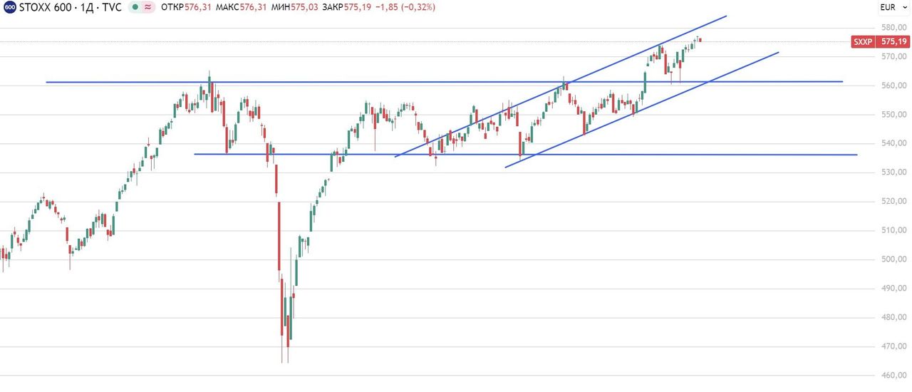 Euro STOXX 600 Индекс Stoxx 600 продолжает находиться в границах восходящего канала на историческом максимуме. Индикатор RSI равен 62, что говорит о перекупленности и возможной коррекции до нижней границы канала и уровня поддержки 561.