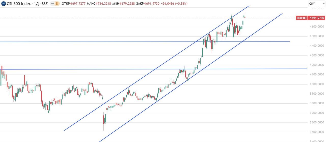 CSI 300 Индекс CSI 300 продолжает свой рост, пробив все уровни сопротивления. Индекс остается перекупленным (RSI = 61), возможна коррекция до уровня 4450. Однако индекс остается в восходящем канале, и в случае продолжения ралли возможно возвращение к значениям 2021 года (4800 – 5900).