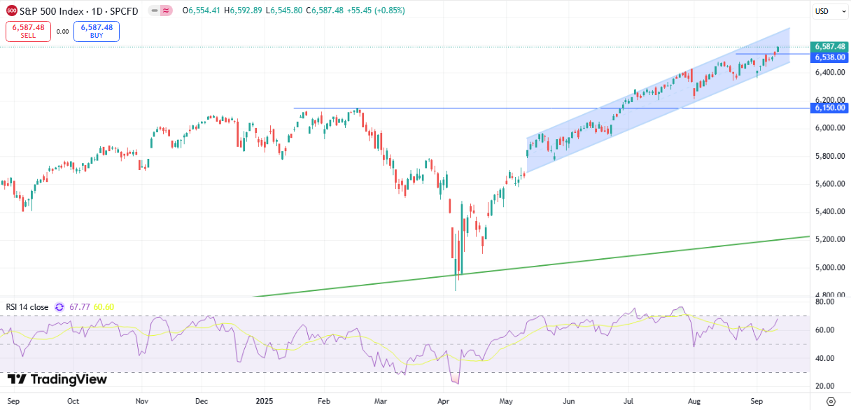 Накануне акции США дружно продолжили рост. Три основных фондовых индекса достигли рекордных значений, прибавив от 0,72% по NASDAQ Composite до 1,36% по DJIA. Трейдеры закладывали в цены 93% уверенности в снижение ставки на 0,25 п.п. на заседании ФРС 17 сентября. При этом признаки охлаждения рынка труда и умеренная инфляция повысили до 7% ожидания более глубокого снижения ставки до 0,5 п.п., а также укрепили ожидания еще двух снижений до конца года.