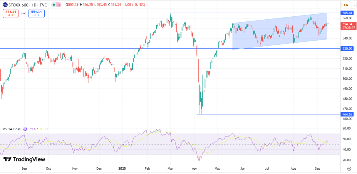 Индекс STOXX 600 остается зажатым между уровнем сопротивления, который сформировался в районе исторического максимума около 565 пунктов и долгосрочным уровнем поддержки, который сохраняется около значения 530 пунктов.