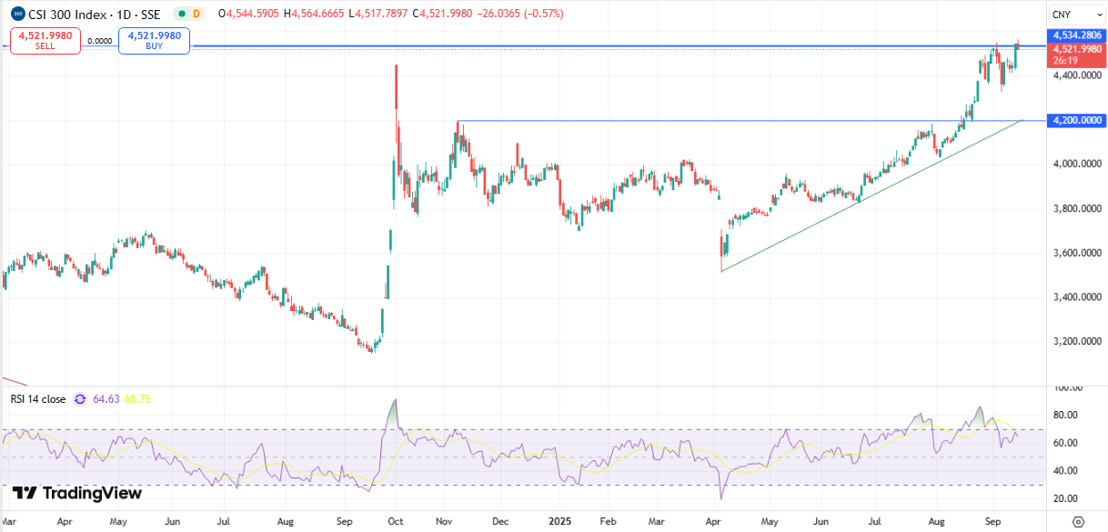 Индекс CSI 300 снова не смог закрепиться выше уровня сопротивления в районе 4530, который сформировался еще в июле 2022 г. Силу сопротивления подтверждается дивергенцией RSI в зоне перекупленности. Уровень поддержки сохраняется в районе выше 4200 пунктов.