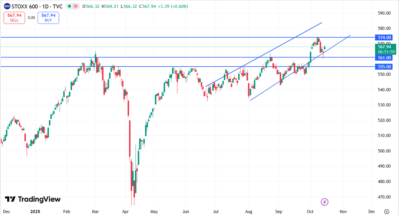 Euro STOXX 600 Индекс STOXX 600 торгуется на уровне 567,68 пункта, оставаясь ниже недавних максимумов после локальной коррекции. Несмотря на краткосрочное ослабление, цена пока удерживается выше ключевой зоны поддержки в районе 561 пунктов, пробой которой откроет путь к следующей важной отметке на уровне 555 пунктов. В то же время закрепление выше 574 пунктов станет сигналов к возобновлению восходящего тренда.